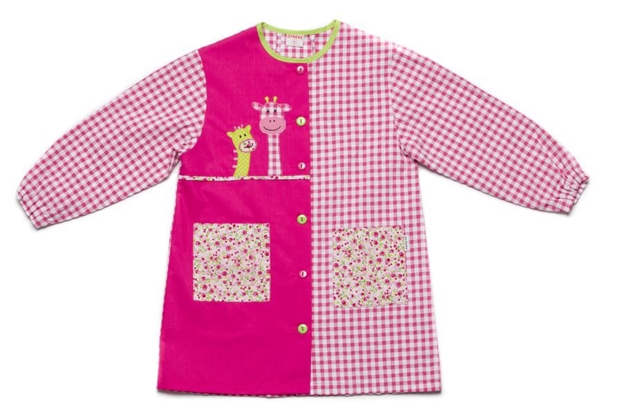 Bata infantil de manga larga con cuello redondo. El tejido es de cuadros en un lado y en el otro es liso con jirafas bordadas. Las mangas son igual al tejido. Tiene dos bolsillo inferiores en tejido de contraste. Se abrocha con botones. Los puños son de goma.