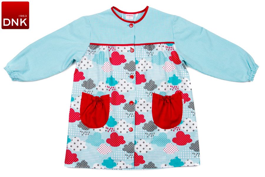 Bata infantil de manga larga fabricada en tejido suave con llamativo estampado 'Nubes' en colores turquesa y rojo , combinado en parte superior y mangas con cuadro turquesa. Puños de goma y cuello redondo en contraste color rojo vivo . Lleva 2 bolsillos inferiores en color rojo vivo con detalle fruncido. Se abrocha con botones.