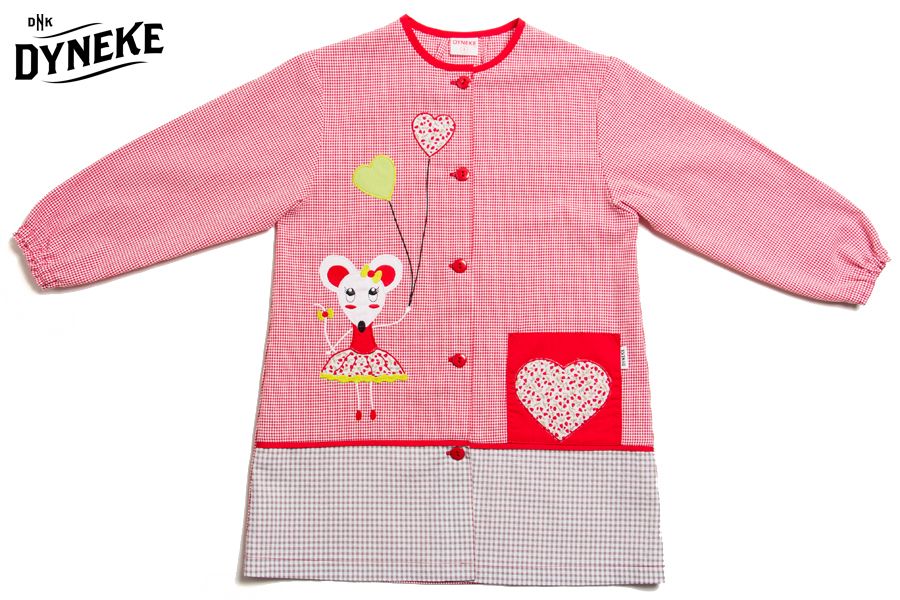 Bata escolar de niña en manga larga y cuello redondo. Lleva los puños de goma. Tejido muy suave en cuadro rojo con un gracioso bordado de "ratoncita" . Tiene un bolsillo lateral inferior en rojo con bordado de corazon. Cinta en el cuello para colgar la bata. Tallaje : de la T / 0 a la T / 8. Propuestas : guarderías, escuelas, infantil, preescolar, comedores, uso doméstico, fiestas infantiles, regalos.