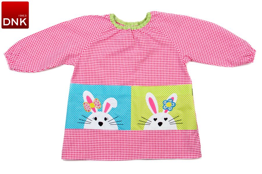 Babi niña guardería en manga larga y cuello redondo elástico. Puños de goma. Tejido muy suave en cuadro fucsia con contraste en pistacho en cuello.Lleva un multibolsillo separado en dos con simpático bordado de 'Conejito' sobre fondo azul y otro sobre verde pistacho.