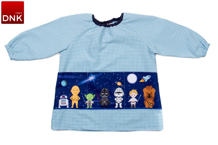 Babi guardería para niño de manga larga y cuello redondo. Fabricado en tejido suave cuadro azul con contraste en azul marino en cuello. Tiene un multibolsillo en la parte inferior con un fantástico estampado de personajes de la guerra de las galaxias sobre fondo azul marino. Los puños son de goma