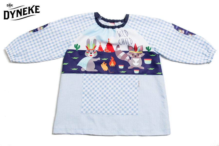 Babi infantil en manga larga. Tiene cuello y puños elásticos. Esta fabricado en un tejido muy suave combinación de cuadro grande y pequeño color azul celeste. En el canesú y las coderas lleva un divertido estampado de mapaches. Bolsillo central inferior. Cinta en el cuello para colgar la bata. Tallaje: de la T/ 0 a la T/ 8. Propuestas: jardín de infancia, guarderías, preescolar, infantil, comedores, uso doméstico, etc.