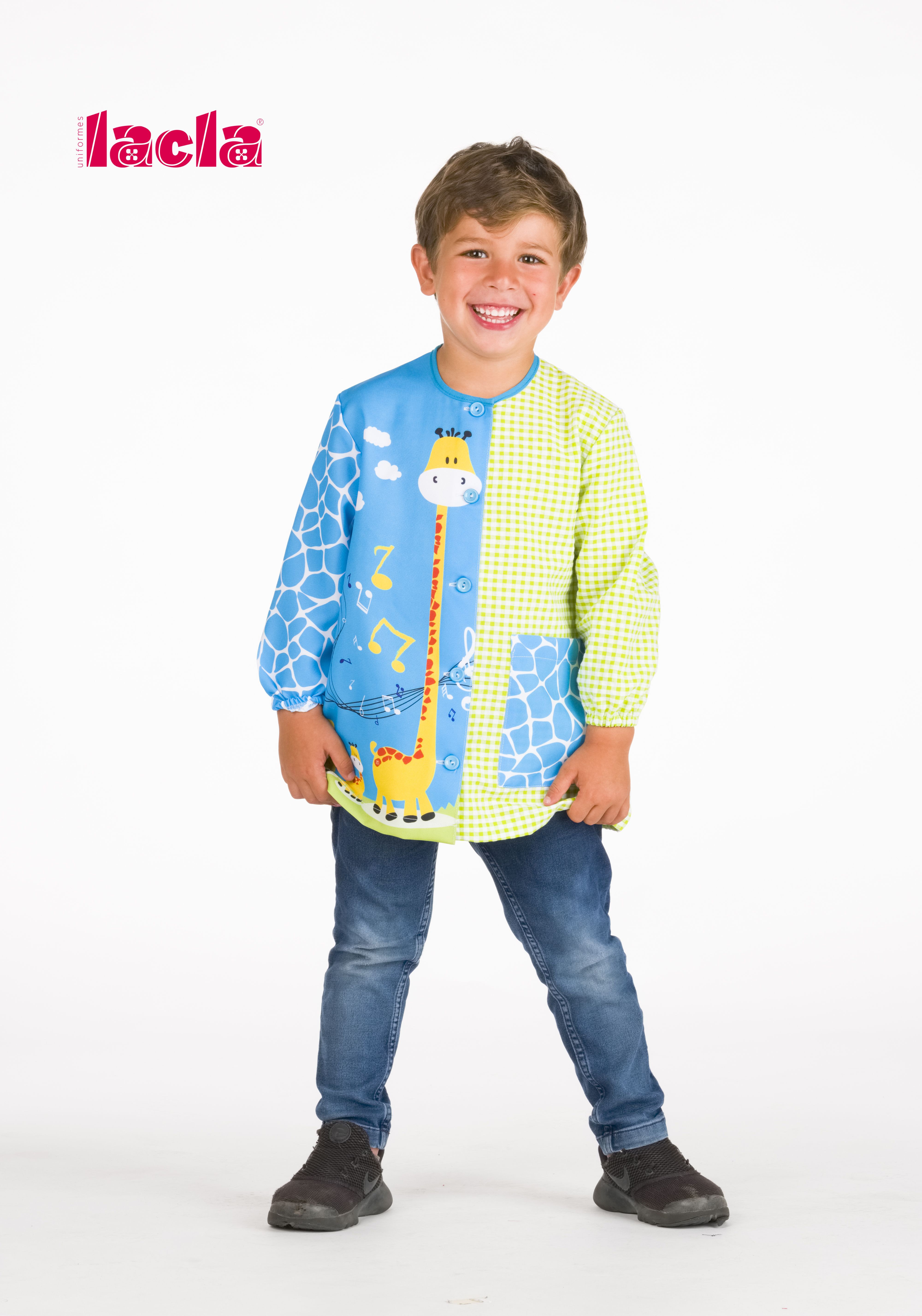 Bata cuadros pitacho school , con botones , manga larga derecha estampada , puños con gomas , 1 delantero y bolsillo estampado. Escote vivo de color. Tira escote para colgar.
