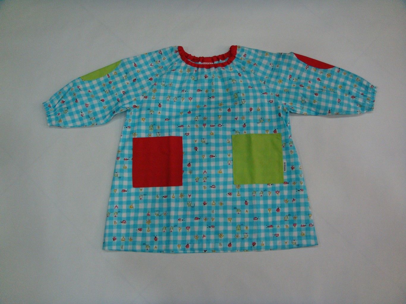 Babi infantil de manga larga con cuello redondo y puños con gomilla. tejido de cuadros estampados azules y dibujos de mariquitas. contrastes al tono.