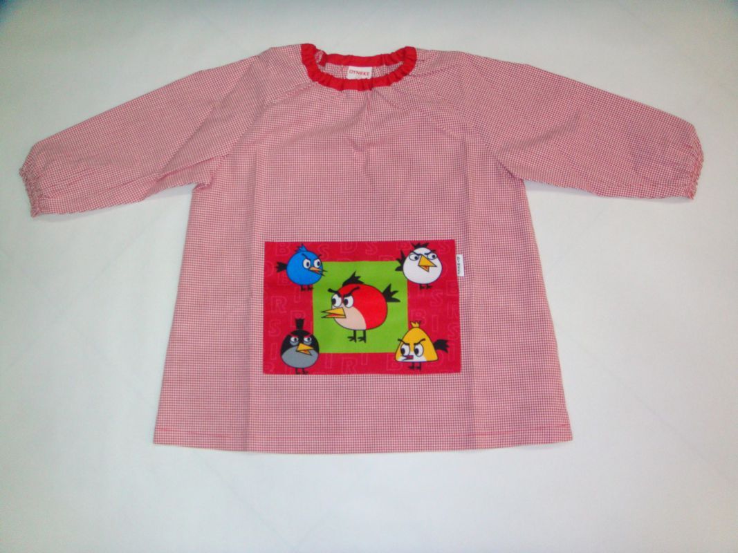 Babi infantil con cuello redondo. Puños y cuello con elásticos. El tejido es de cuadros rojos. Vivo en el cuello de contraste liso. Tiene bolsillos delantero estampados con dibujo angri birds.