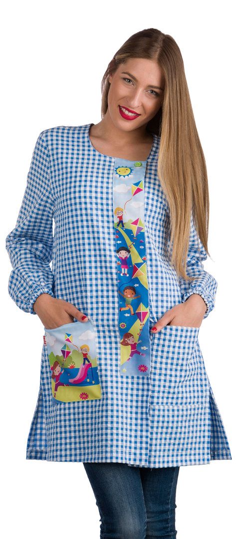 Bata de manga larga con cierre central de botones. Estampado "Cometas" y raya color marino. Dos bolsillos inferiores. Puño con goma.