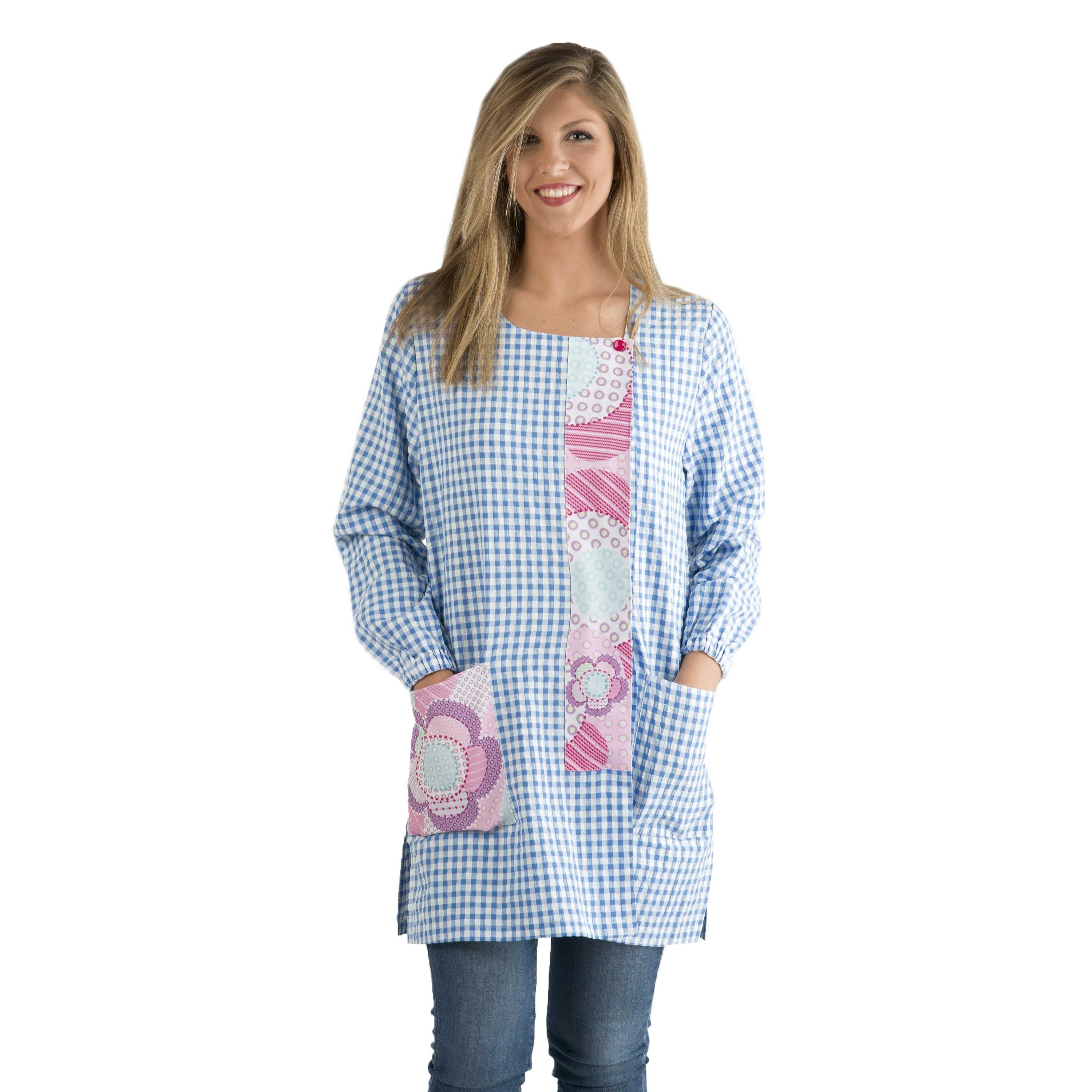 Bata de manga larga con cierre lateral de botones. Estampado "Flor" y cuadro celeste. Dos bolsillos inferiores. Puño con goma.